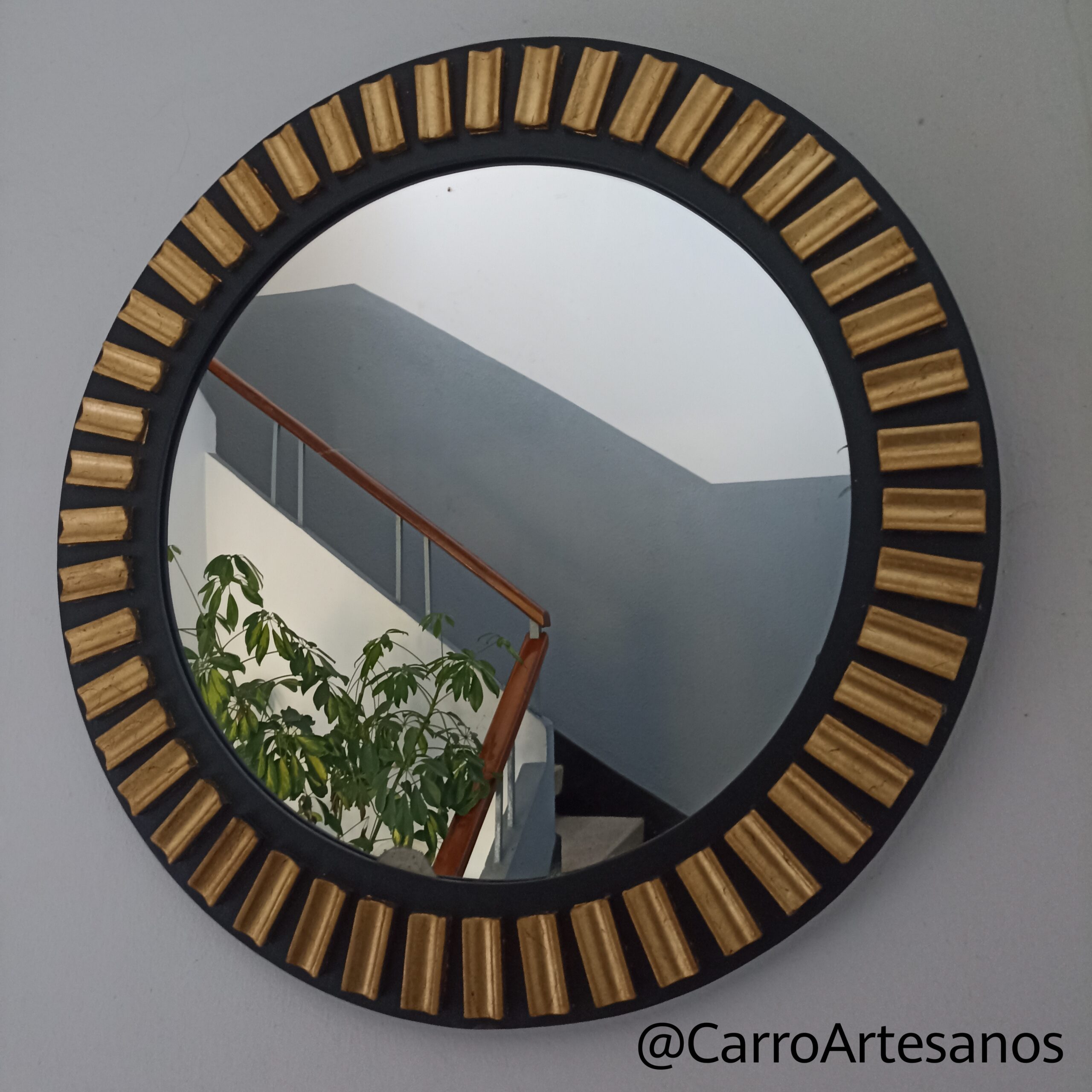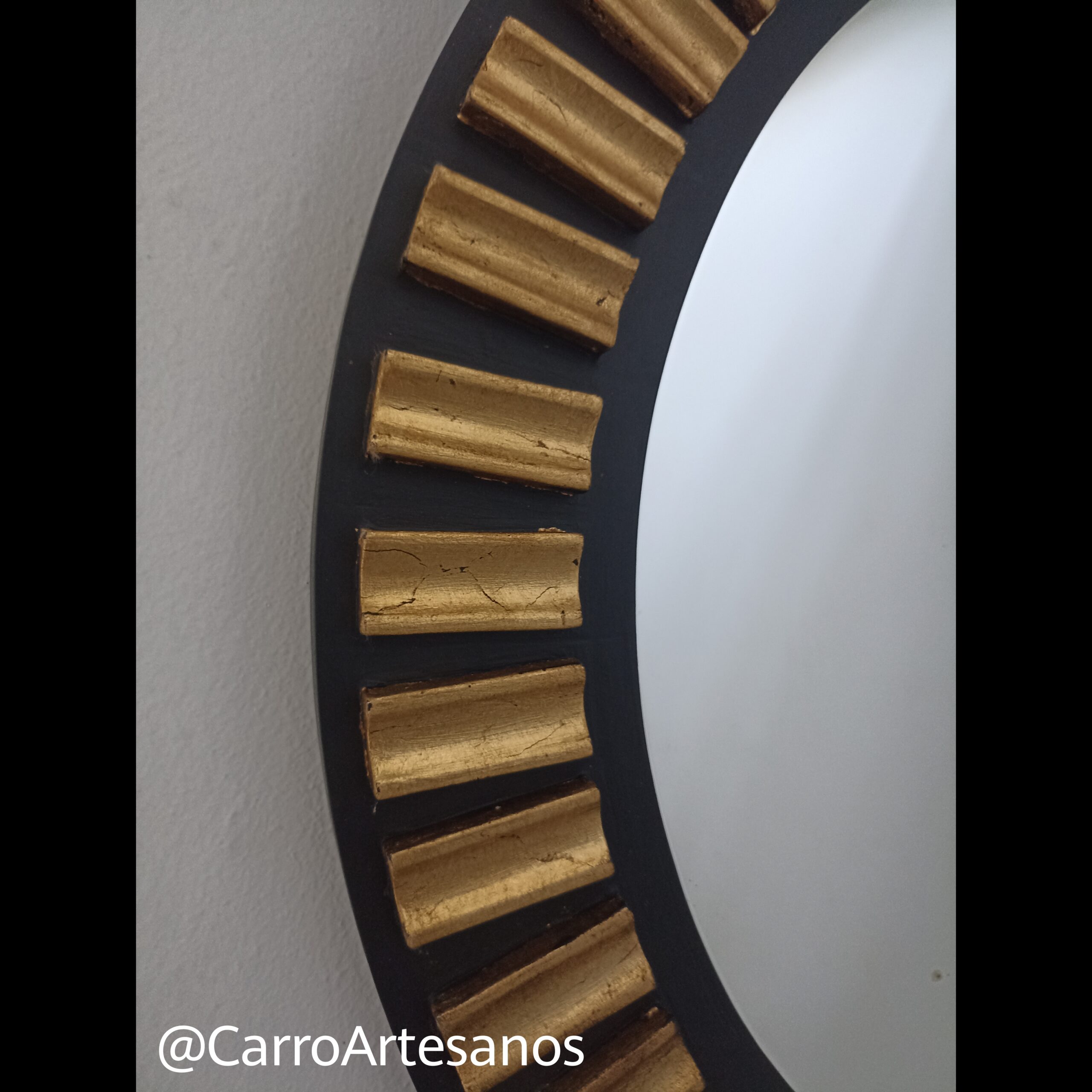 Espejo circular en negro con aplicaciones en pan de oro envejecido